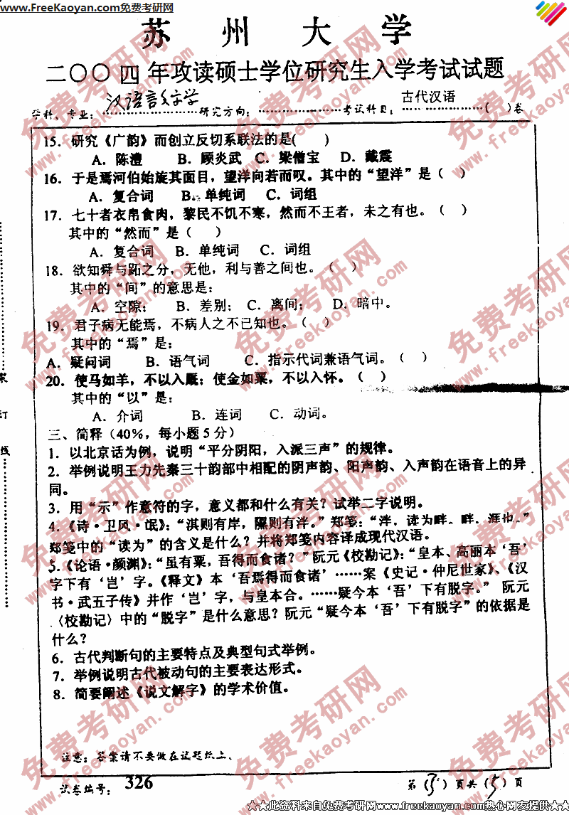 苏州大学2004年考研真题-古代汉语(3)