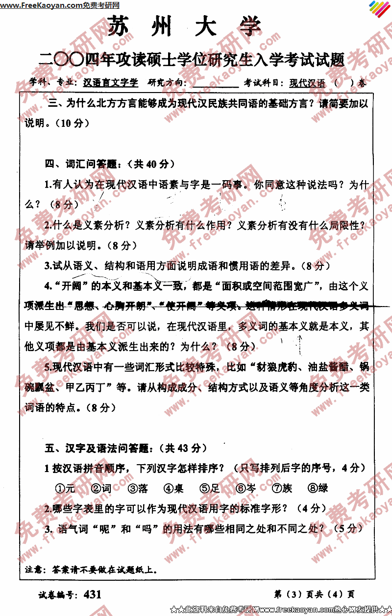 苏州大学2004年考研真题-现代汉语(3)