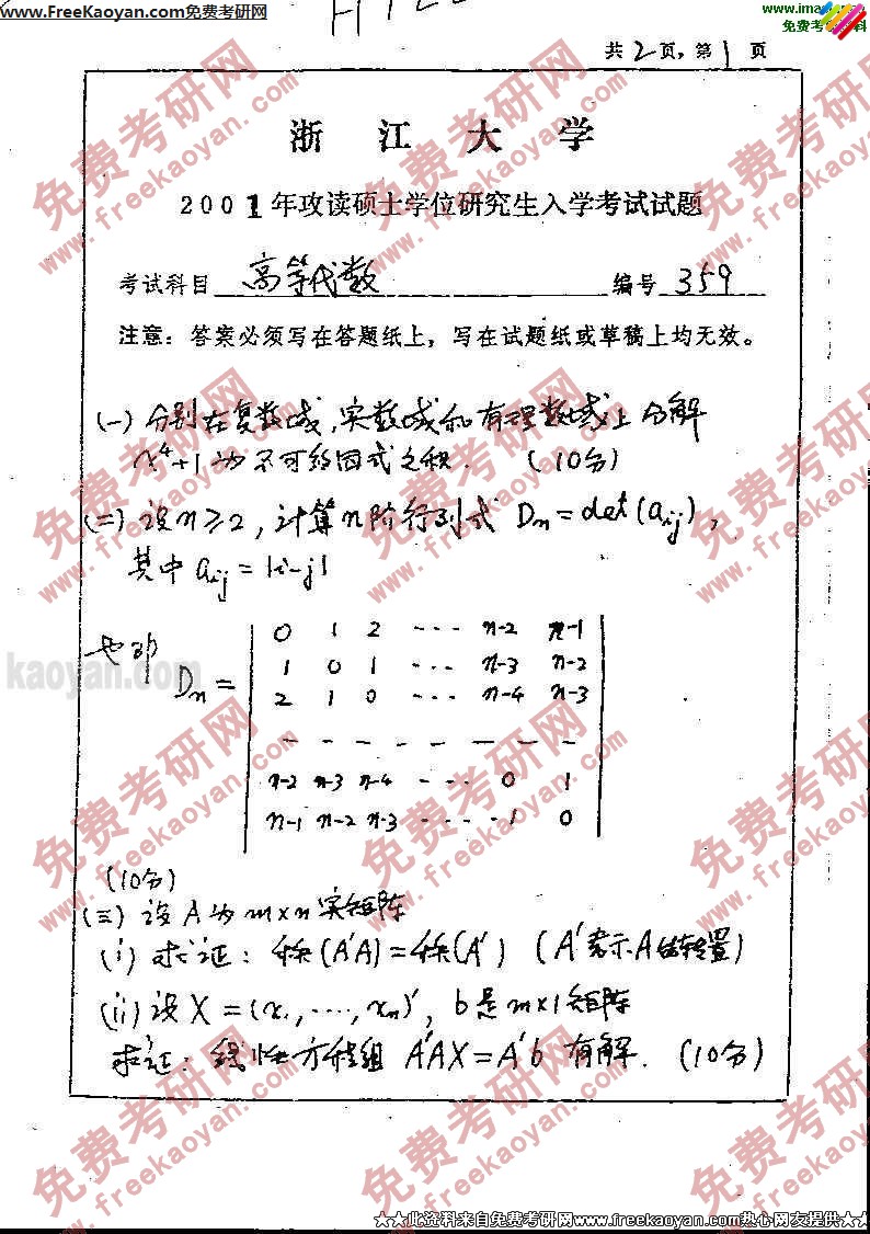 浙江大学2001年考研真题-高等代数
