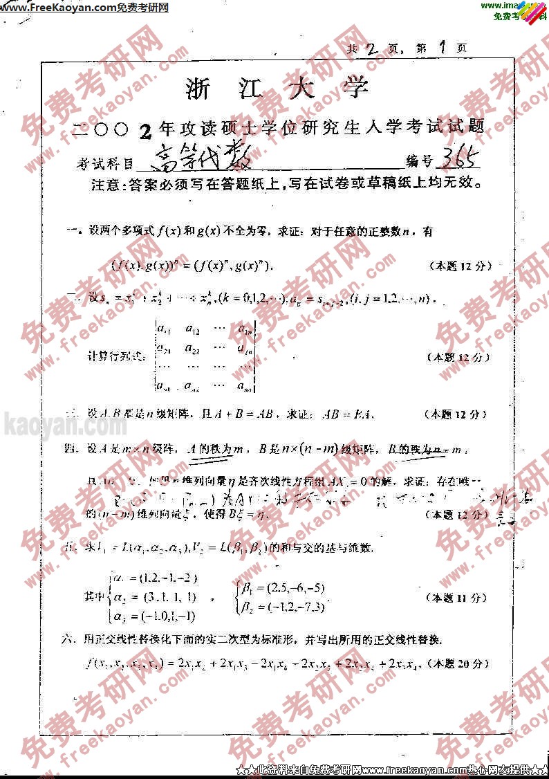 专业课考研经验 本站小编 FreeKaoyan 2018-01-23浙江大学2000年考研真题-高等代数