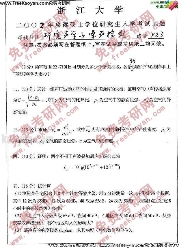 浙江大学2002年考研真题-环境声学与噪声控制