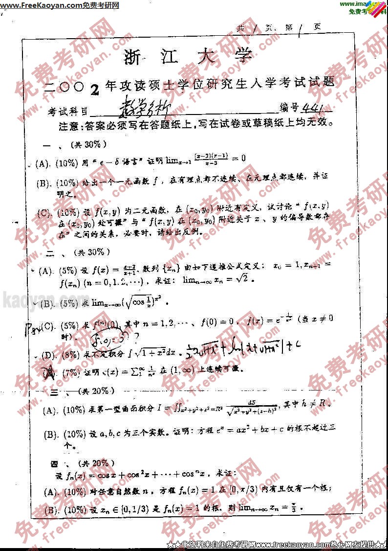 浙江大学2002年考研真题-数学分析