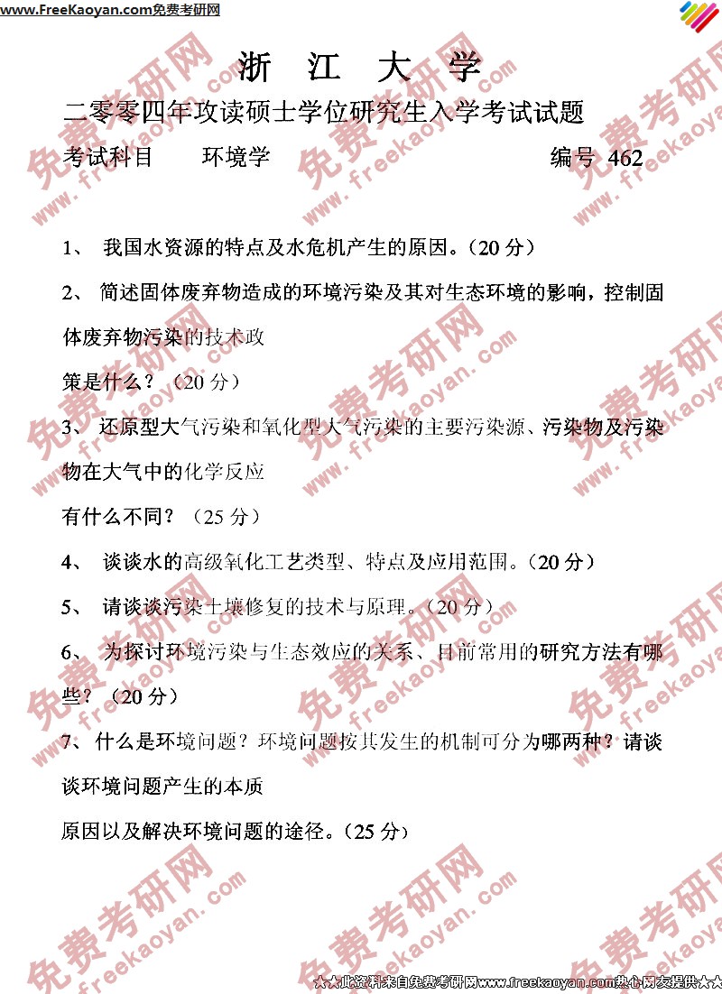 浙江大学2004年考研真题-环境学