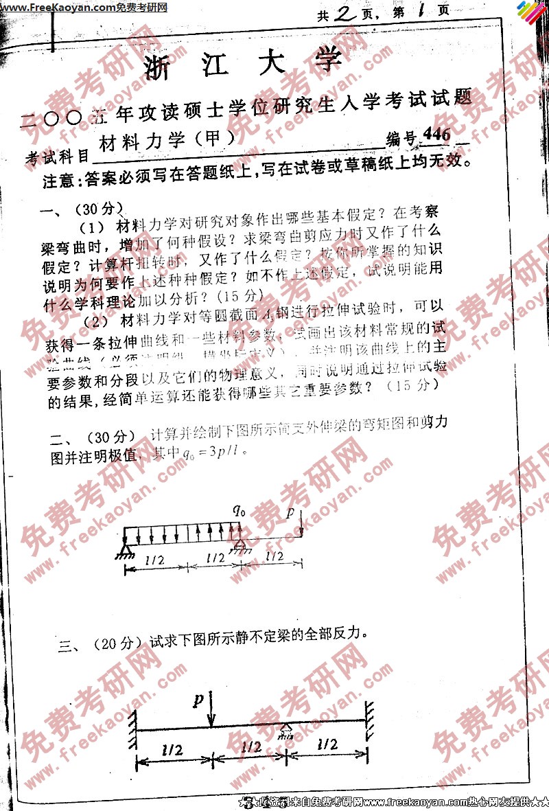 专业课考研经验 本站小编 FreeKaoyan 2018-01-23浙江大学2004年考研真题-材料力学(甲)