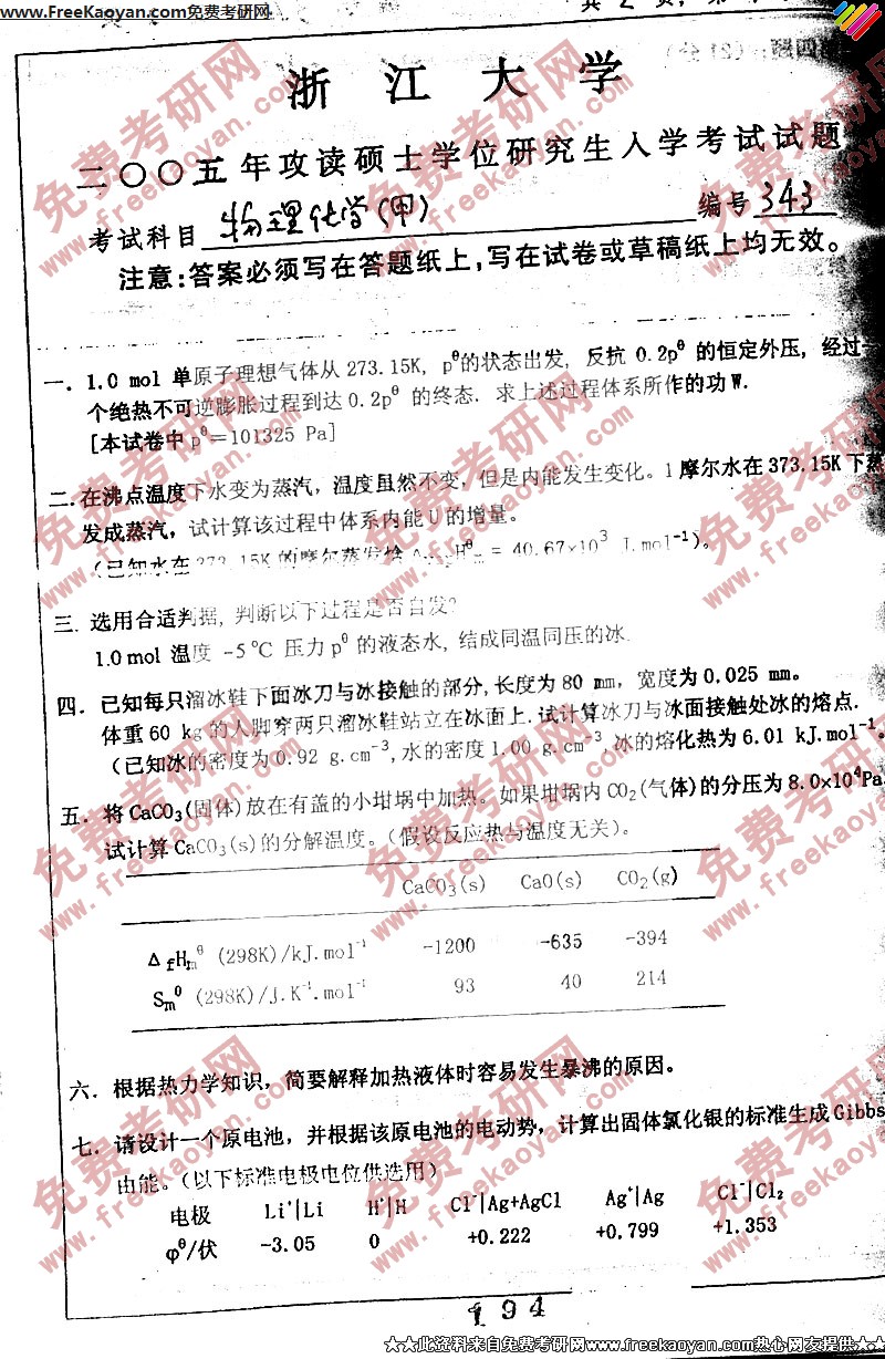 专业课考研经验 本站小编 FreeKaoyan 2018-01-23浙江大学2004年考研真题-物理化学(甲)
