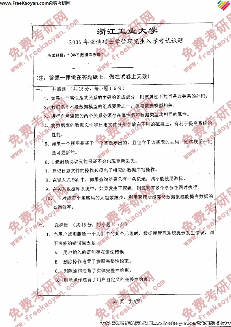 浙江工业大学2006年考研真题-数据库原理