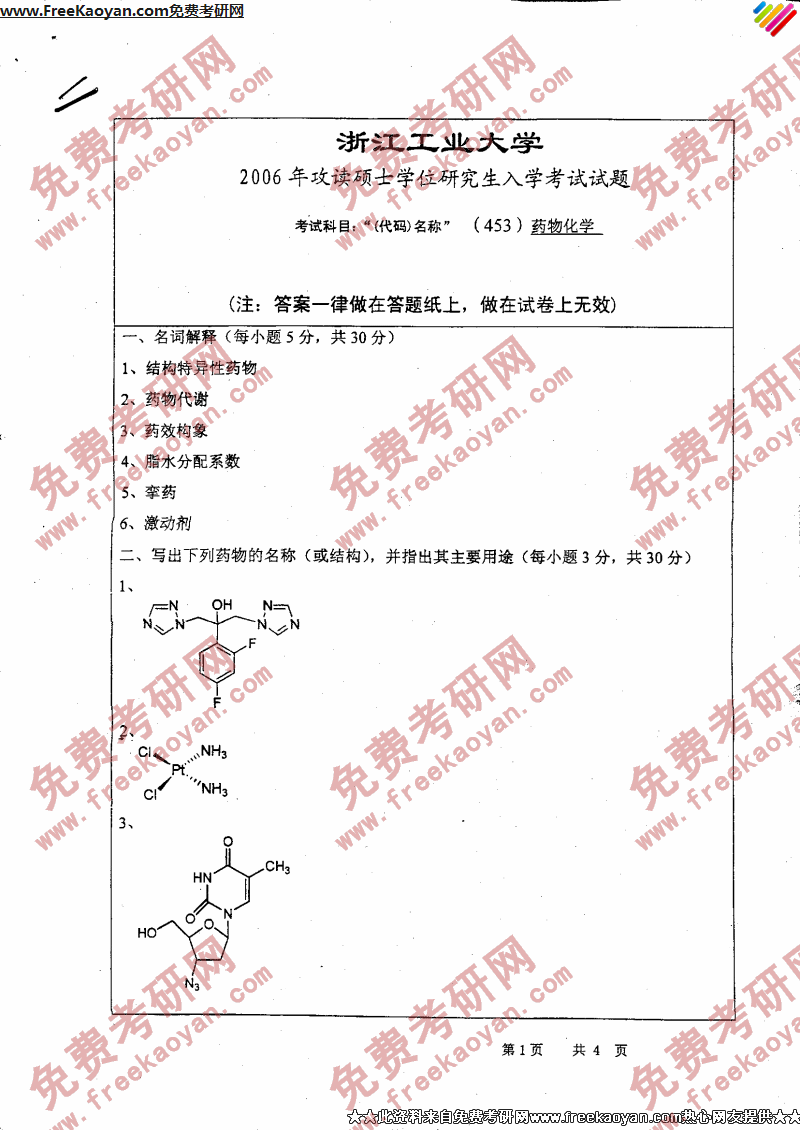 专业课考研经验 本站小编 FreeKaoyan 2018-01-23浙江工业大学2006年考研真题-物理化学