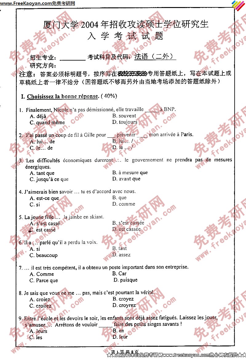 厦门大学2004年考研真题-法语二外