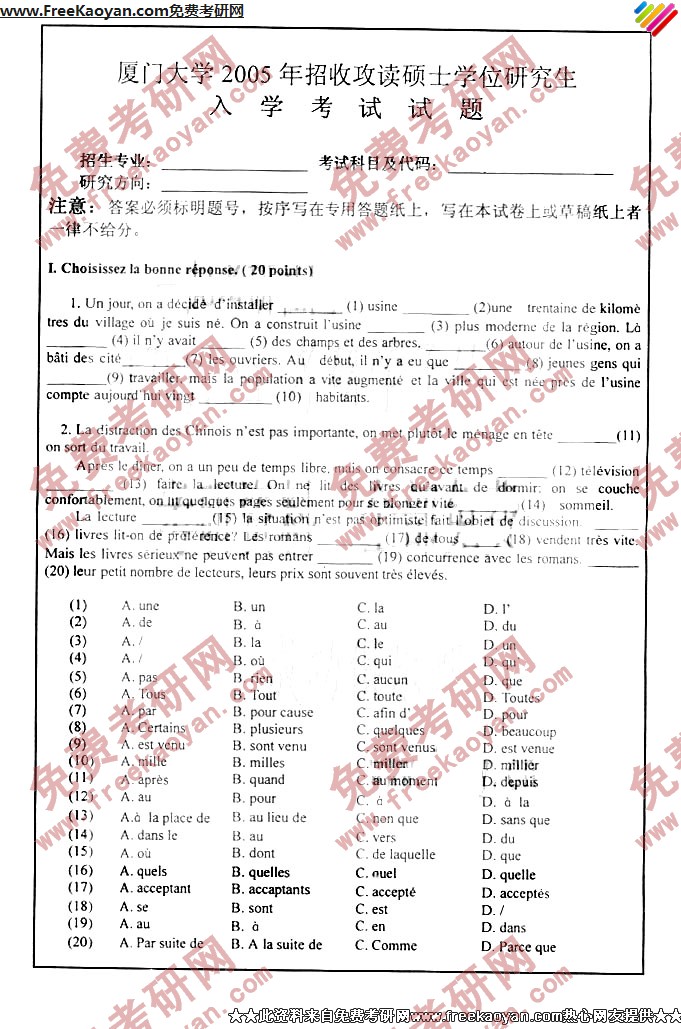 厦门大学2005年考研真题-法语二外