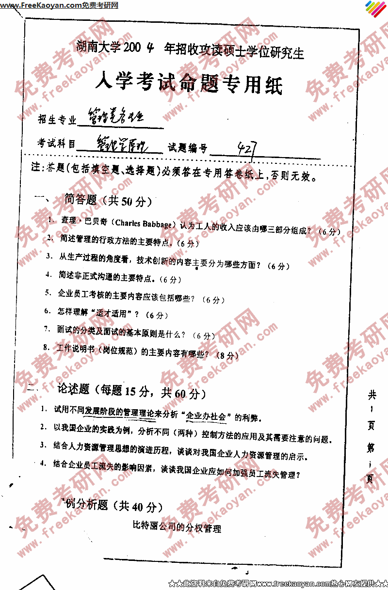 专业课考研经验 本站小编 FreeKaoyan 2018-01-231、在加入WTO形势下,针对河南省农业资源数量与质量、应用与保护中存在的问题,请站在专业高度,综合运用所学专业知识提出今后解决这些问题的指导思想、工作思路、发展途径以及所应采取的措施和办法。(70分)2、在四年大学生活中,你从知识、能力和素质上都有哪些收获和提高?毕业实习中,你做过哪些研究工作,毕业 ...