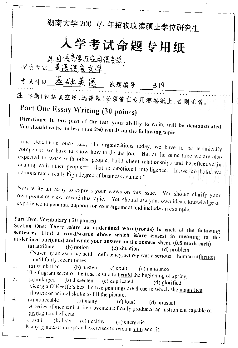 湖南大学2004年考研真题-基础英语