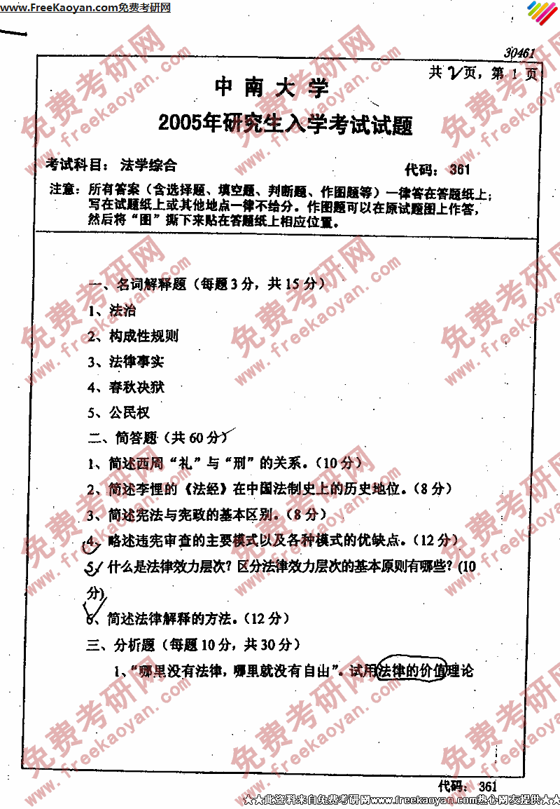 中南大学2005年考研真题-法学综合