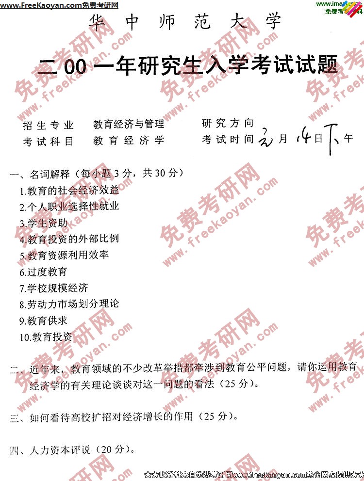 专业课考研经验 本站小编 FreeKaoyan 2018-01-23华中师范大学2000年考研真题-教育经济学