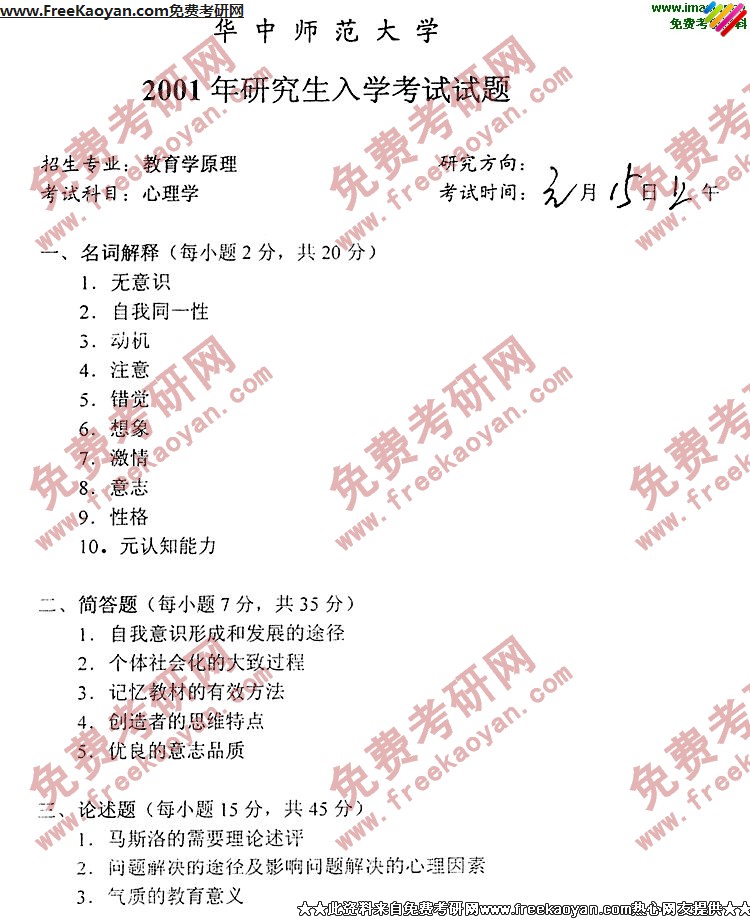 专业课考研经验 本站小编 FreeKaoyan 2018-01-23华中师范大学2001年考研真题-教育学