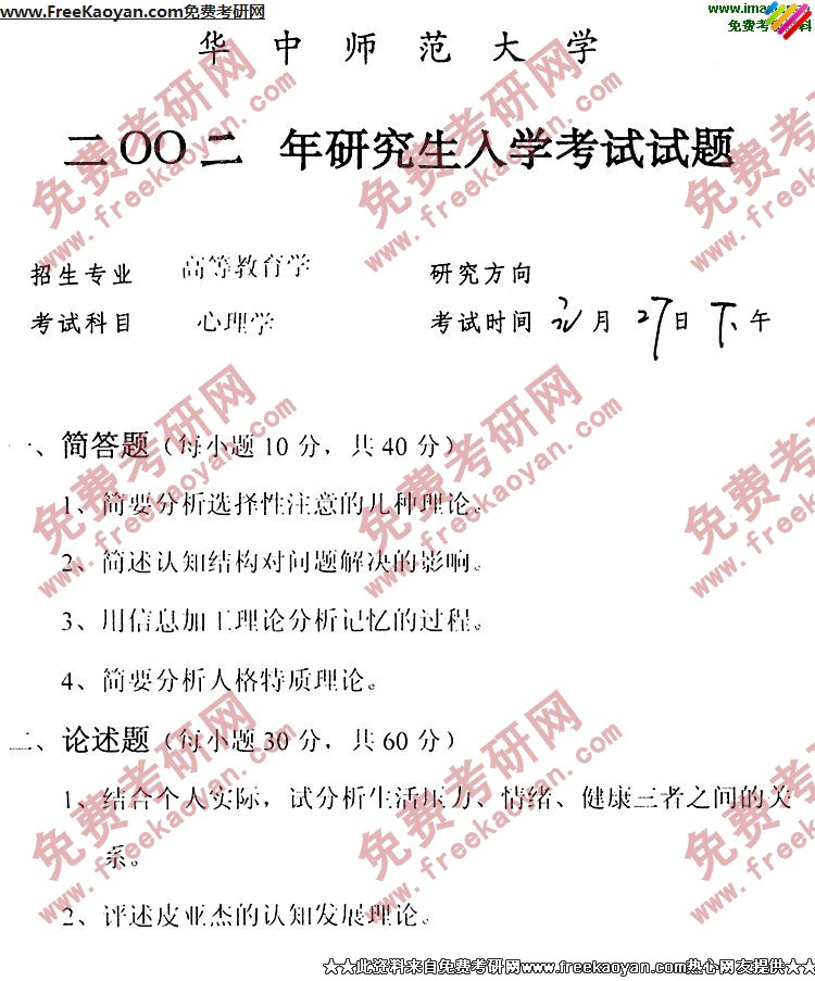 专业课考研经验 本站小编 FreeKaoyan 2018-01-23华中师范大学2002年考研真题-教育学