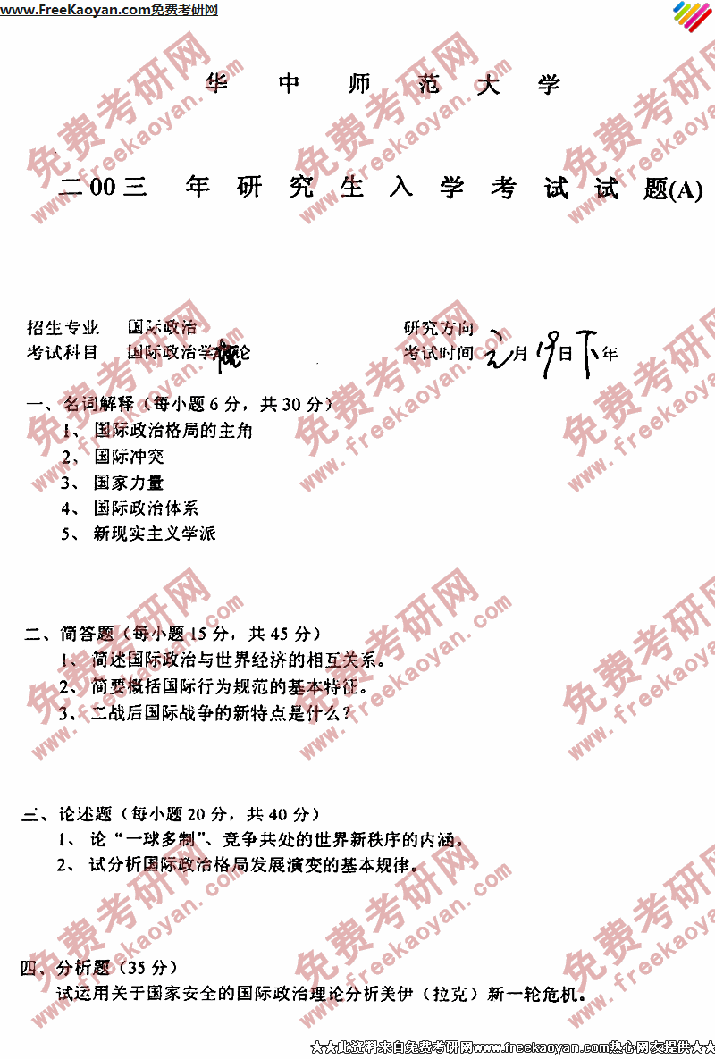 华中师范大学2003年考研真题-国际政治学概论