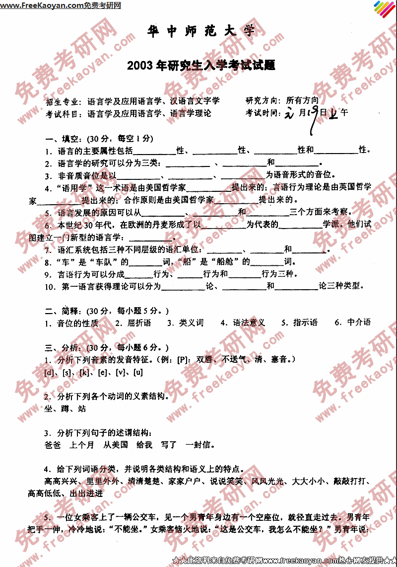 华中师范大学2003年考研真题-语言学及应用语言学、语言学理论