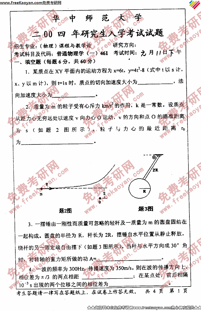 专业课考研经验 本站小编 FreeKaoyan 2018-01-23华中师范大学2004年考研真题-普通物理学(二)