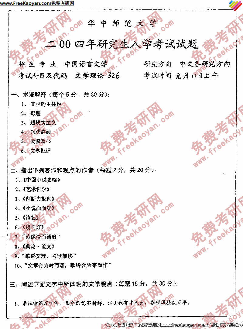 专业课考研经验 本站小编 FreeKaoyan 2018-01-23华中师范大学2003年考研真题-中国现当代文学(复试)