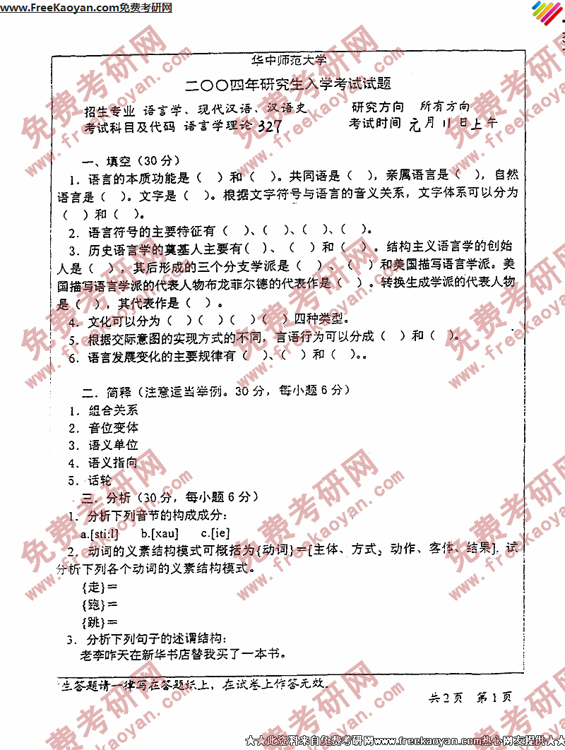 专业课考研经验 本站小编 FreeKaoyan 2018-01-23华中师范大学2003年考研真题-语言学及应用语言学、语言学理论