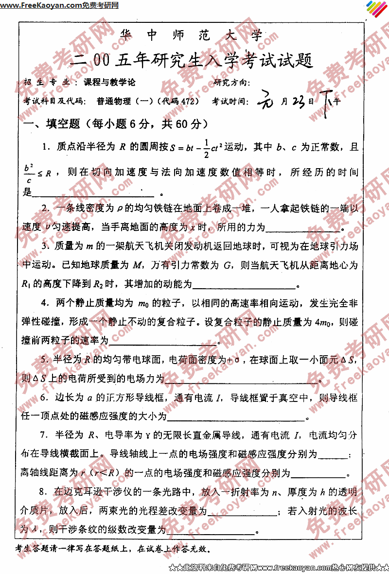 专业课考研经验 本站小编 FreeKaoyan 2018-01-23华中师范大学2005年考研真题-普通物理学(二)