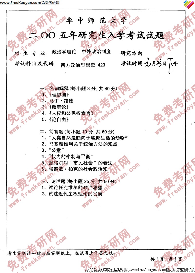 专业课考研经验 本站小编 FreeKaoyan 2018-01-23华中师范大学2004年考研真题-西方政治思想史