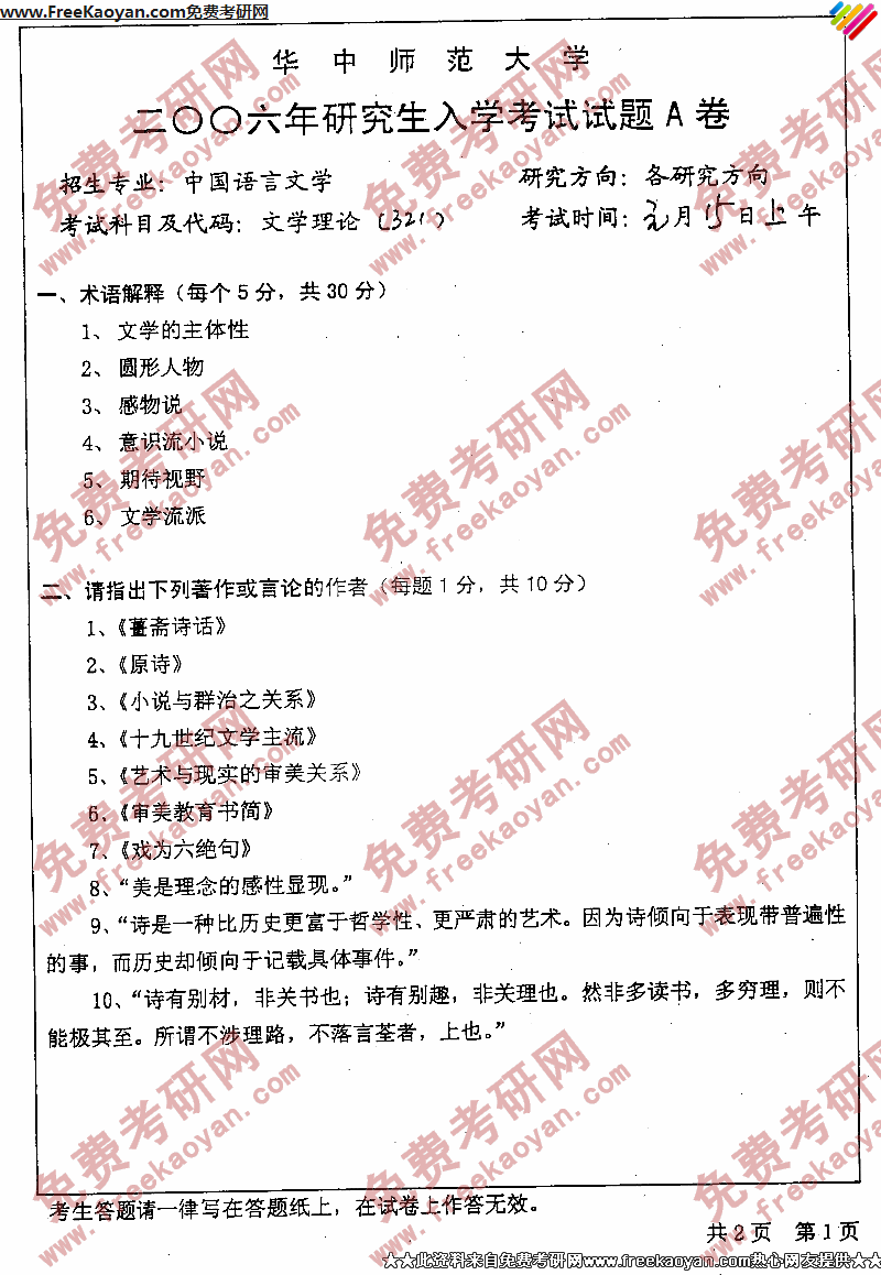 专业课考研经验 本站小编 FreeKaoyan 2018-01-23华中师范大学2005年考研真题-文学理论