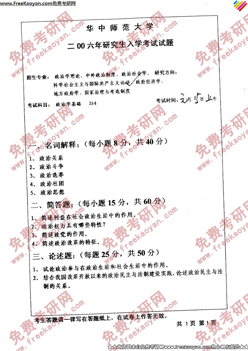 专业课考研经验 本站小编 FreeKaoyan 2018-01-23华中师范大学2006年考研真题-西方政治思想史
