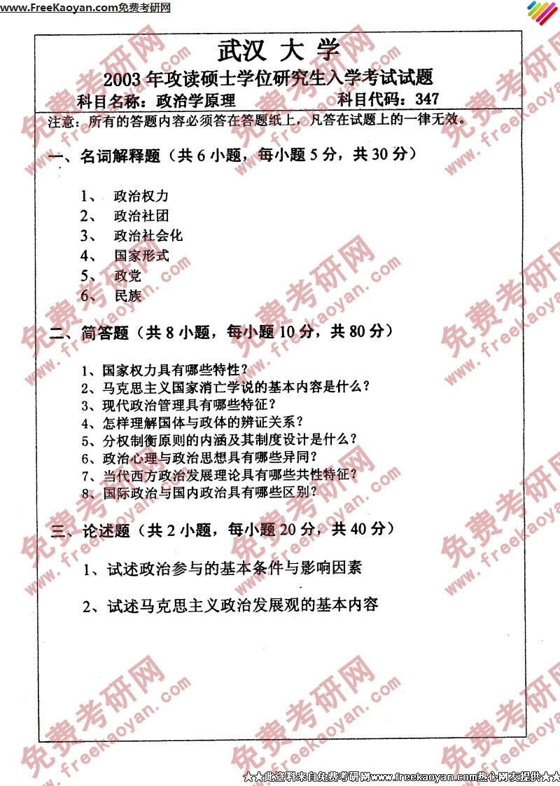 专业课考研经验 本站小编 FreeKaoyan 2018-01-23武汉大学2001年考研真题-中外近现代政治思想