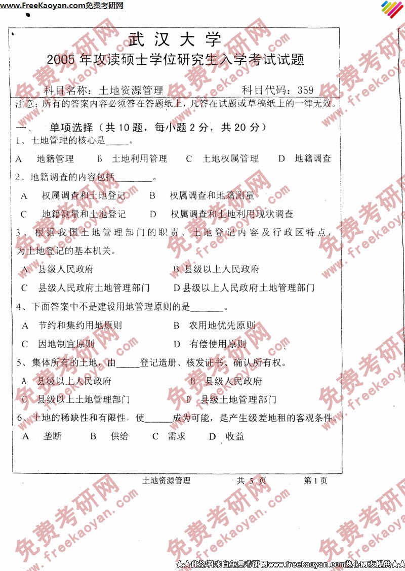 专业课考研经验 本站小编 FreeKaoyan 2018-01-23武汉大学2004年考研真题-土地资源管理