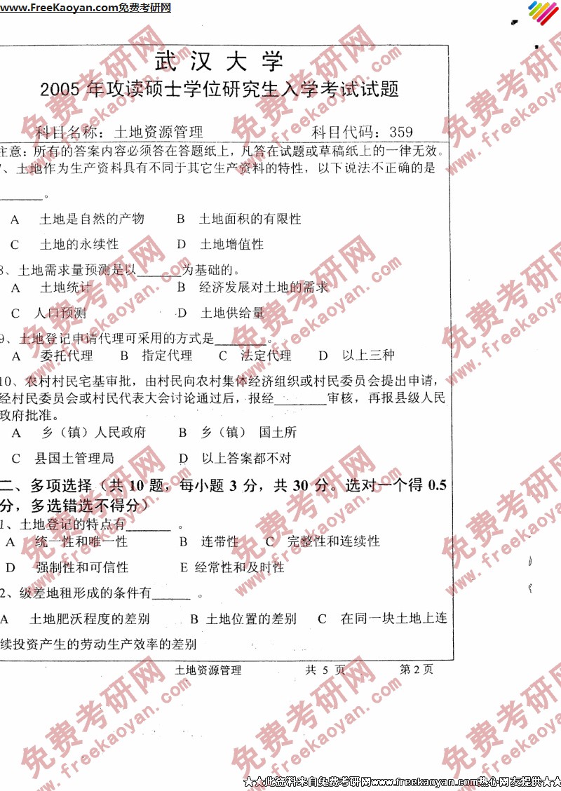 专业课考研经验 本站小编 FreeKaoyan 2018-01-23武汉大学2004年考研真题-土地资源管理