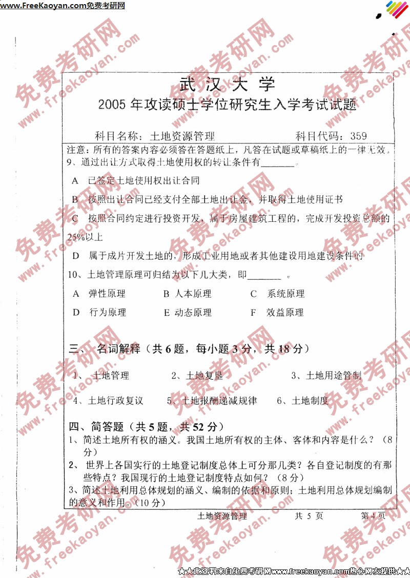 专业课考研经验 本站小编 FreeKaoyan 2018-01-23武汉大学2004年考研真题-土地资源管理