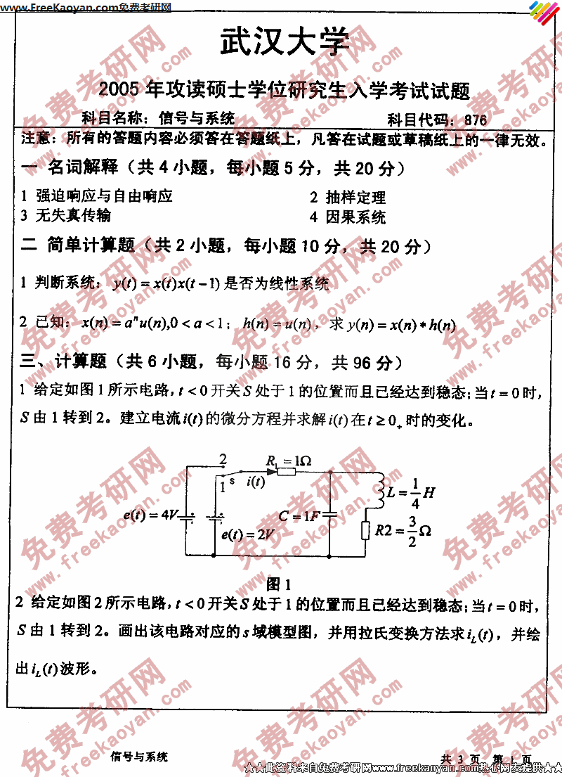 专业课考研经验 本站小编 FreeKaoyan 2018-01-23武汉大学2005年考研真题-信号与系统
