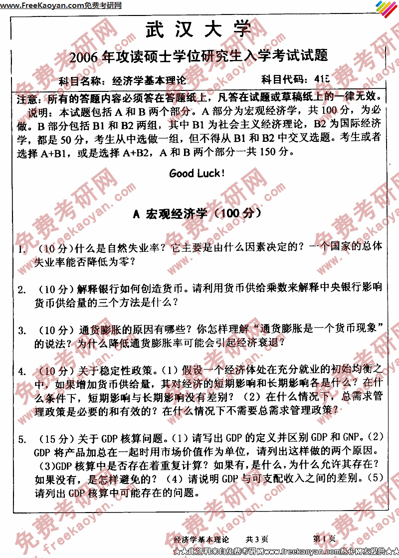 专业课考研经验 本站小编 FreeKaoyan 2018-01-23武汉大学2005年考研真题-经济地理学