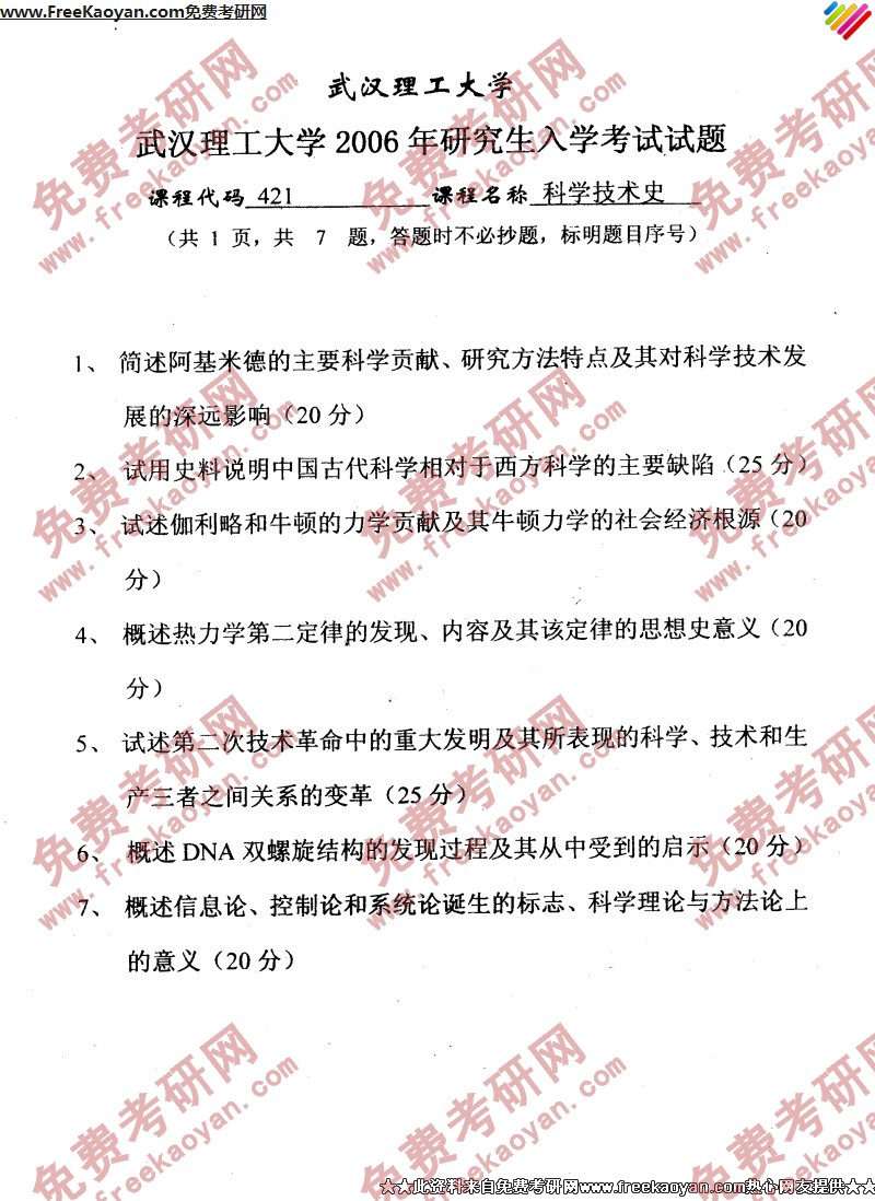 专业课考研经验 本站小编 FreeKaoyan 2018-01-23武汉理工大学2005年考研真题-科学技术史