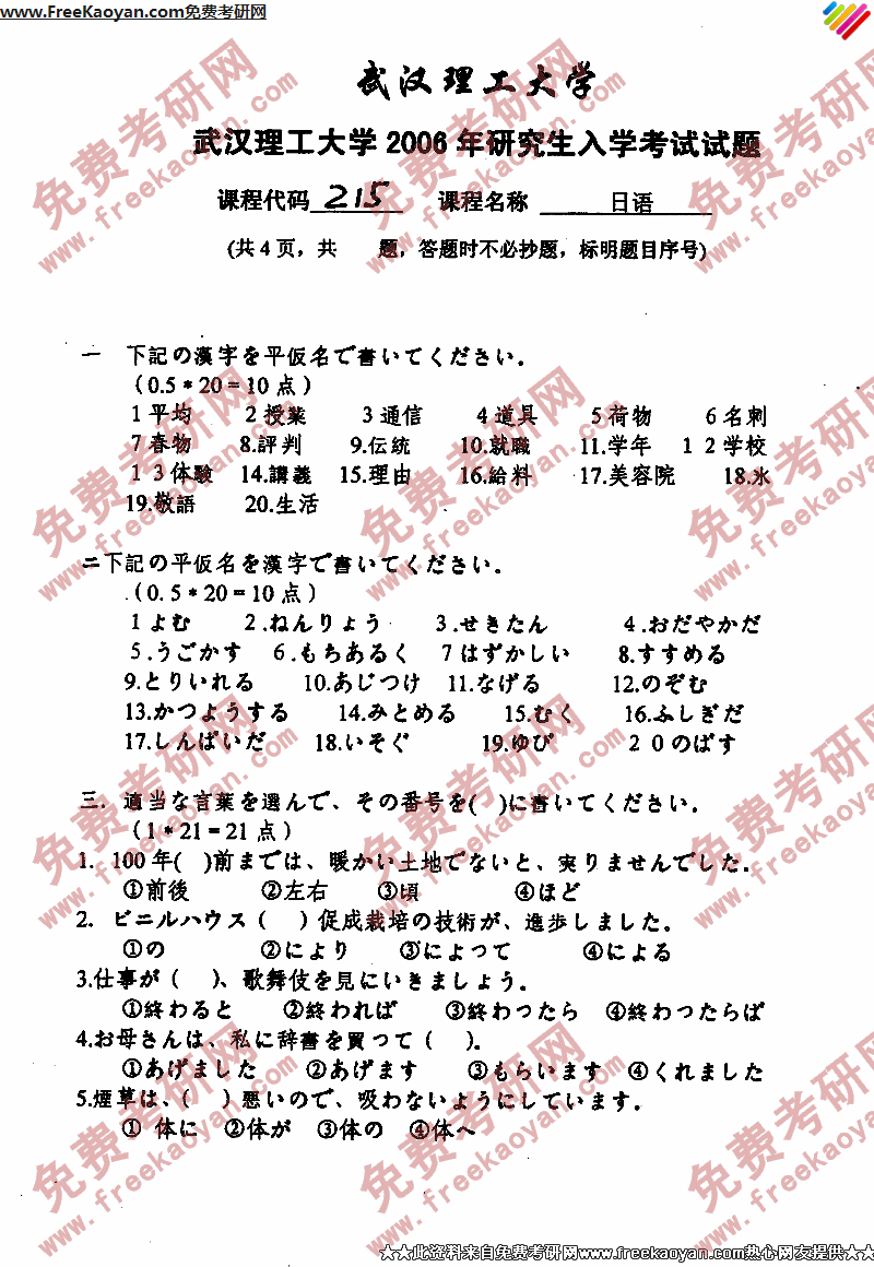 专业课考研经验 本站小编 FreeKaoyan 2018-01-23武汉理工大学2005年考研真题-日语(二外)