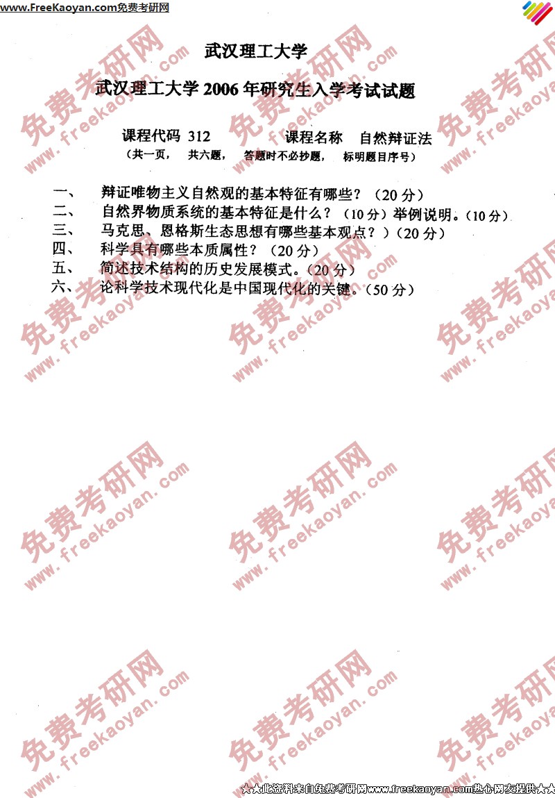 专业课考研经验 本站小编 FreeKaoyan 2018-01-23武汉理工大学2006年考研真题-科学技术史