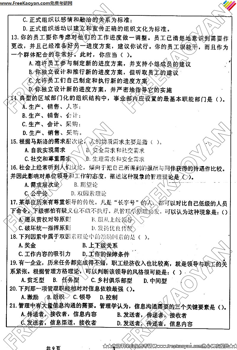复试同等学力加试试卷加试科目:管理学原理 复试专业:企业管理 考生姓名: 准考证号: 总分:一、简述题(每小题20分,共60分)。1、“在相当程度上管理就是决策”,你对这种提法有何认识?2、双因素理论的基本内容是什么?在现实管理实践中如何运用这种理论?3、企业管理现代化应该包括哪些方面?请谈谈你对推 ...