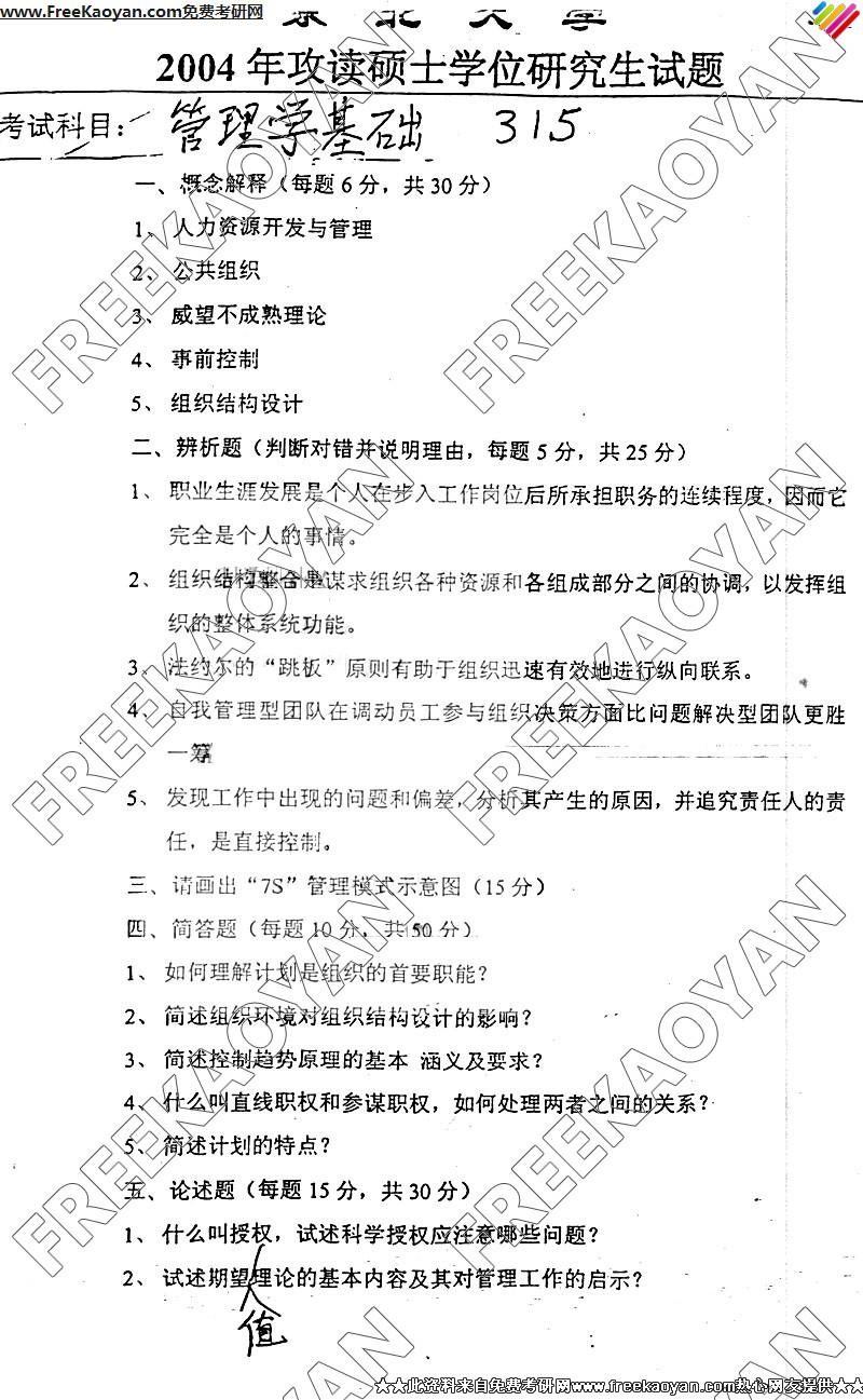专业课考研经验 本站小编 FreeKaoyan 2018-01-23武汉理工大学2003年企业管理概论复试试卷复试科目 : 企业管理概论 复试专业 : 管理科学与工程 姓 名 准考号 成 绩 说明:本复试试卷分为A、B两卷,报考信息管理与信息系统方向的考生请选择B卷,其他考生请选择A卷。A卷(共4题,其中第1题25分、第2题20分、第3题25分、第4题30分,共计1 ...