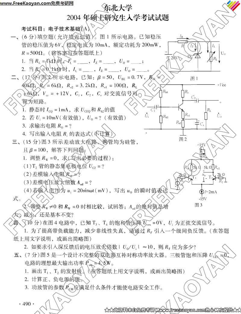 东北大学2004年考研真题-电子技术基础A