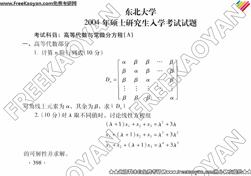 专业课考研经验 本站小编 FreeKaoyan 2018-01-23东北大学2004年考研真题-高等代数与常微分方程(A)
