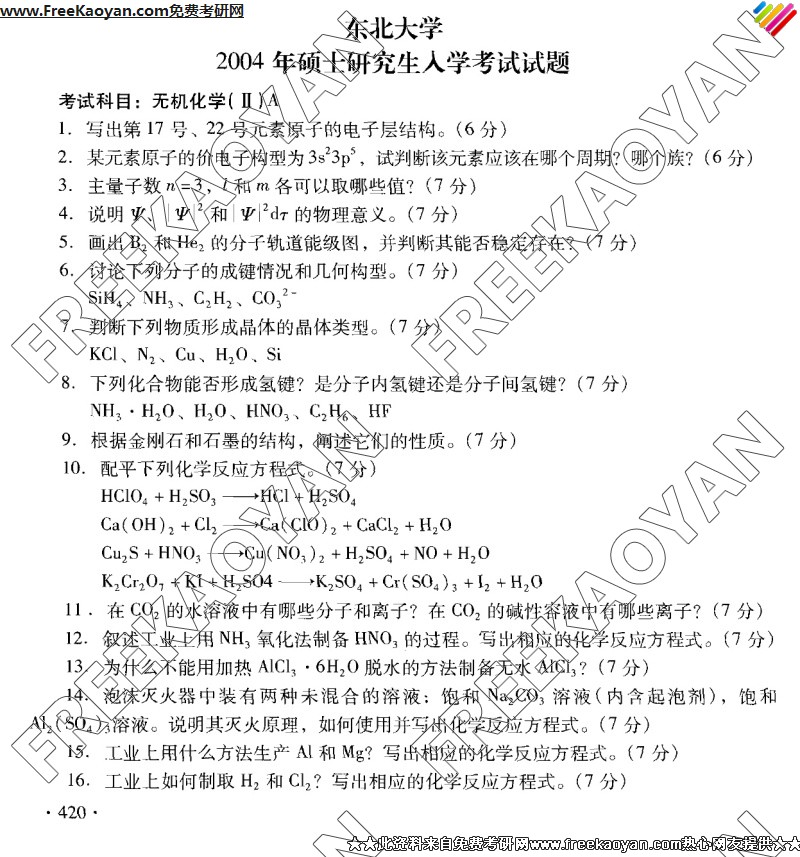 专业课考研经验 本站小编 FreeKaoyan 2018-01-23东北大学2004年考研真题-大学化学B