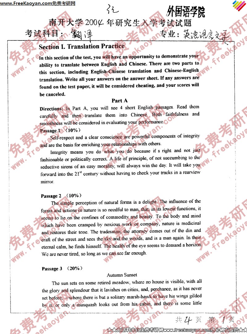 专业课考研经验 本站小编 FreeKaoyan 2018-01-23南开大学2004年考研真题-比较文学