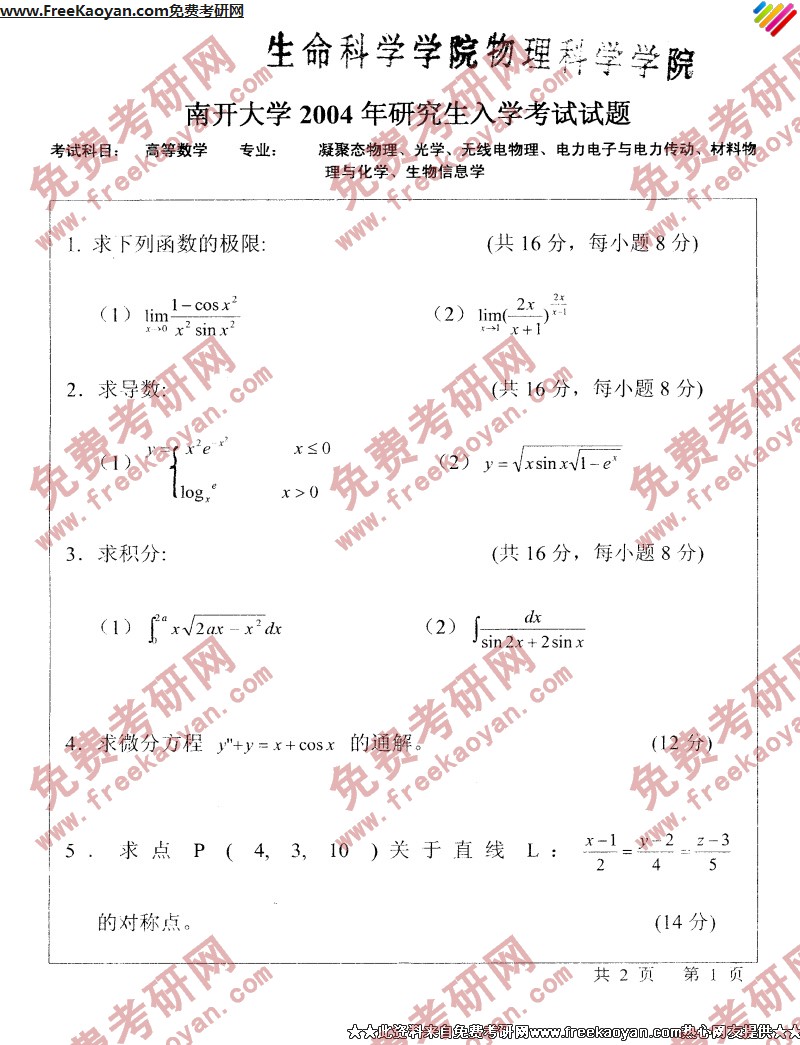专业课考研经验 本站小编 FreeKaoyan 2018-01-23南开大学2004年考研真题-大学物理
