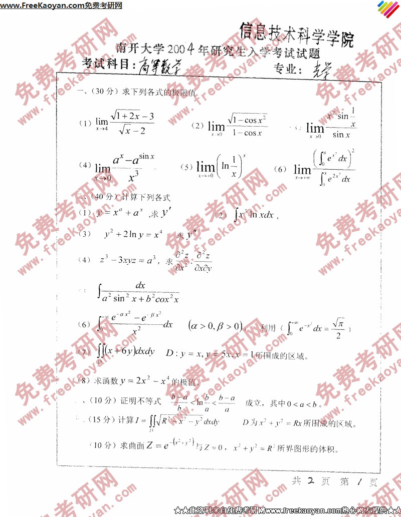 专业课考研经验 本站小编 FreeKaoyan 2018-01-23南开大学2004年考研真题-高等数学