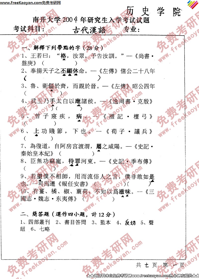 专业课考研经验 本站小编 FreeKaoyan 2018-01-23南开大学2004年考研真题-法制史