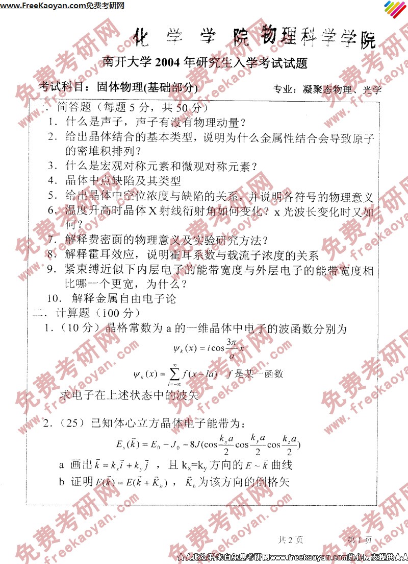 南开大学2004年考研真题-固体物理(基础部分)