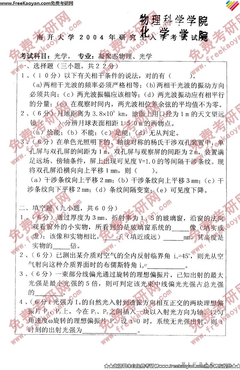 专业课考研经验 本站小编 FreeKaoyan 2018-01-23南开大学2004年考研真题-高等数学(光学)