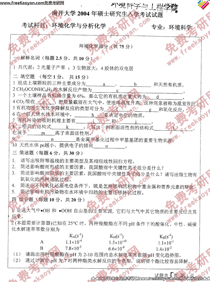 专业课考研经验 本站小编 FreeKaoyan 2018-01-23南开大学2004年考研真题-环境管理