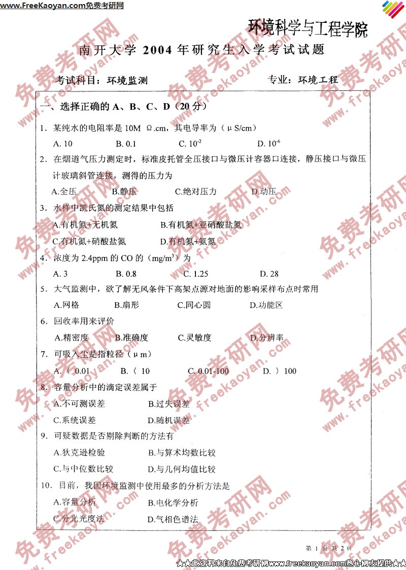 专业课考研经验 本站小编 FreeKaoyan 2018-01-23南开大学2004年考研真题-环境管理
